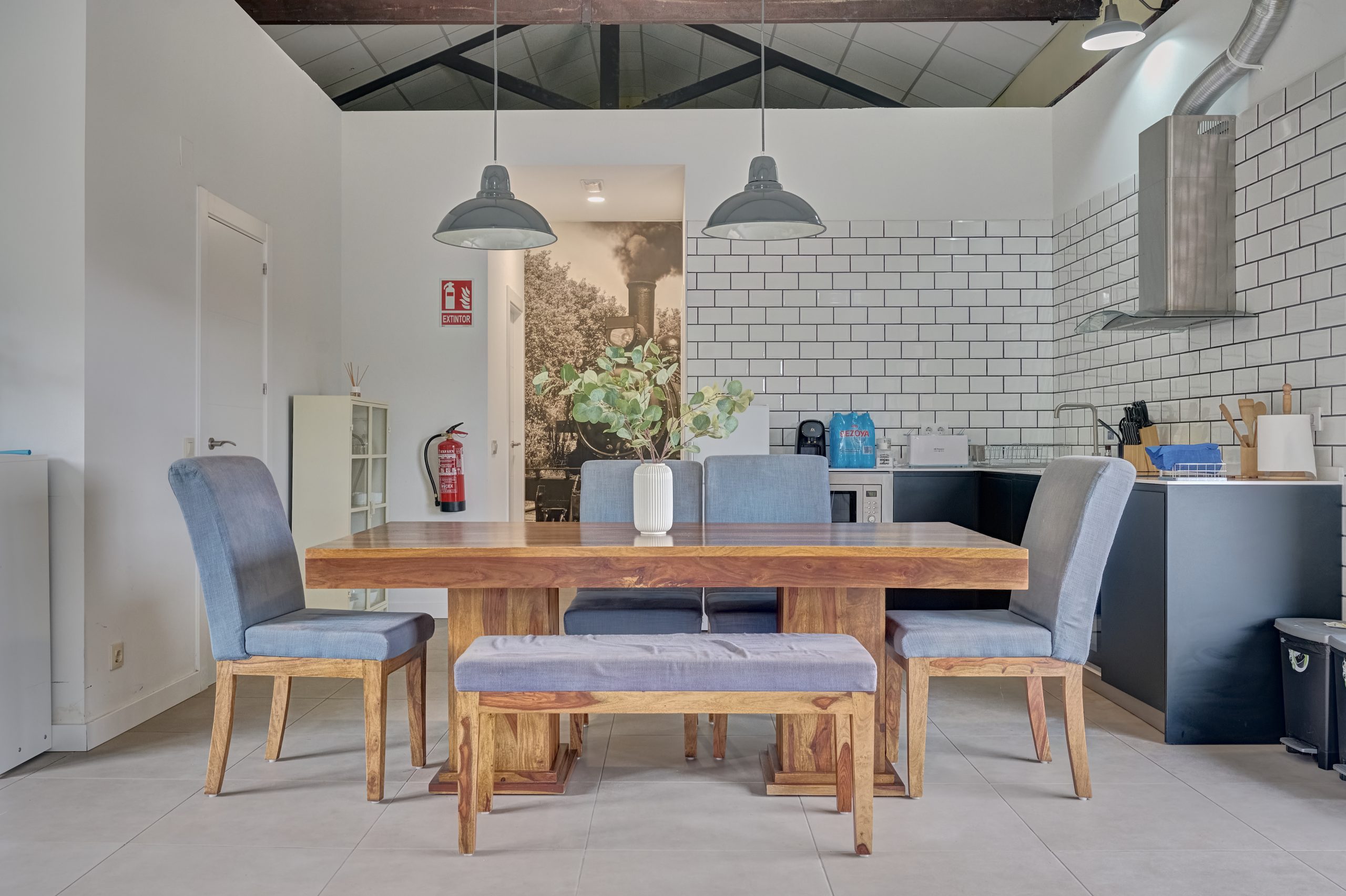 En el interior, el protagonismo se lo lleva un gran espacio diáfano que une salón y cocina, con techos altos y un enorme ventanal que inunda la estancia de luz natural. La gran mesa de comedor permite reunir cómodamente a toda la familia o grupo de amigos, y la zona de estar está pensada para descansar y disfrutar en buena compañía.